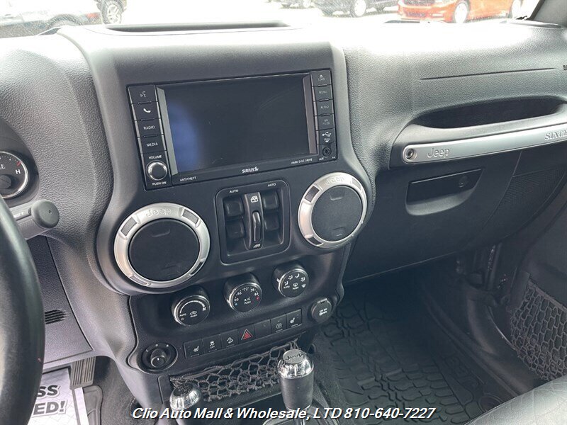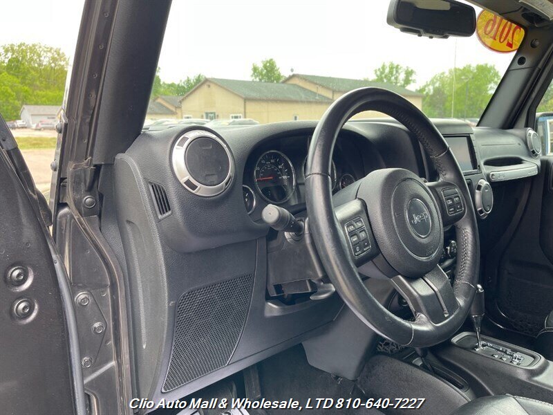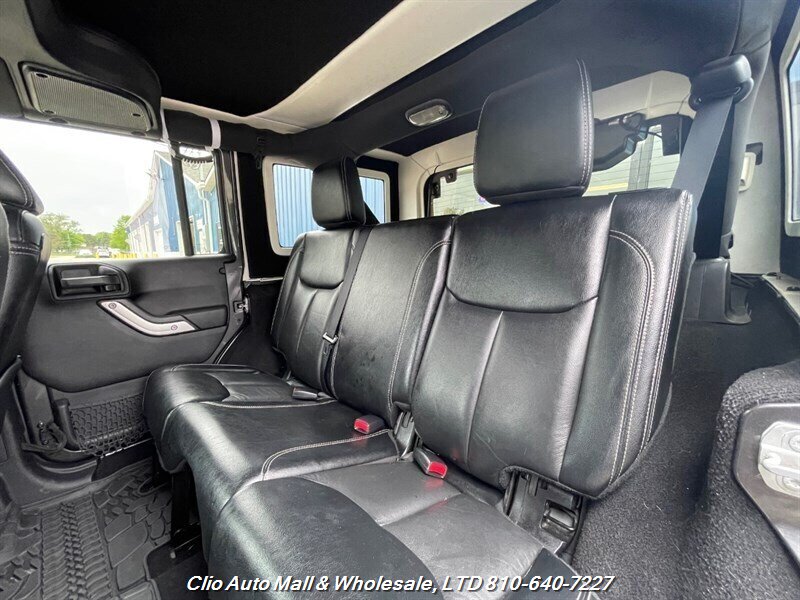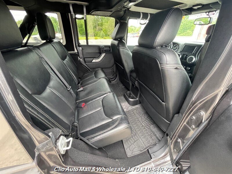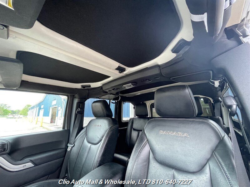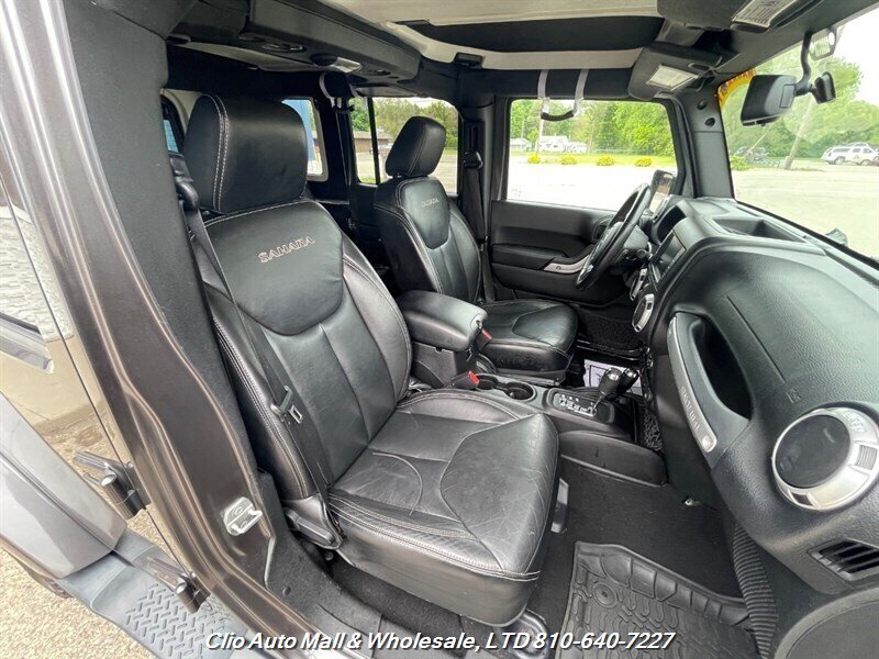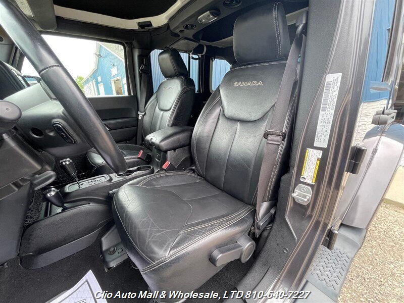 This 2016 Jeep Wrangler Unlimited Sahara 4WD comes with a spotless frame and is equipped with a powerful 3.6L V6 engine delivering 285hp and 260ft. lbs. of torque. The factory default features include the Connectivity Group, MOPAR Premium Sound and Leather Package, and Radio 430NAV. Optional features consist of Air Conditioning with Automatic Temperature Control, Supplemental Front Seat Side Air Bags, Alpine Premium Audio System, MOPAR Slush Mats, Remote Start System, Jeep Trail Rated Kit, 3.73 Axle Ratio, Engine Block Heater, Body Color 3-Piece Hard Top, Leather-Trimmed Bucket Seats, Max Tow Package, and 18.0 x 7.5 Polished Aluminum Wheels. The exterior is Billet Silver Metallic Clear Coat, complemented by a Black interior. This vehicle achieves 16 MPG in the city and 21 MPG on the highway, and is in excellent overall condition.