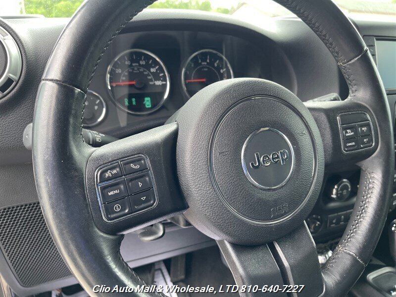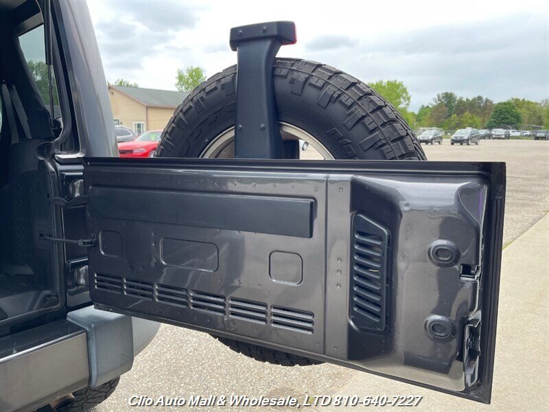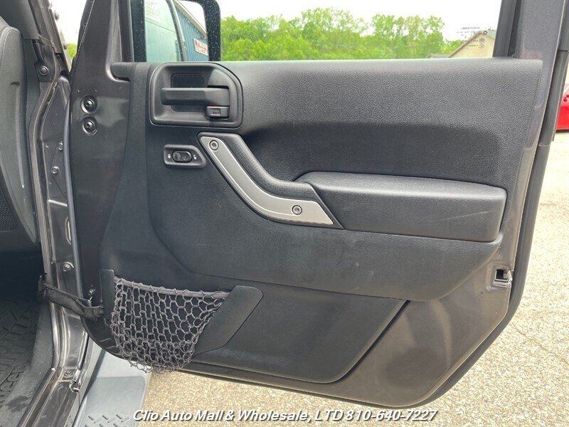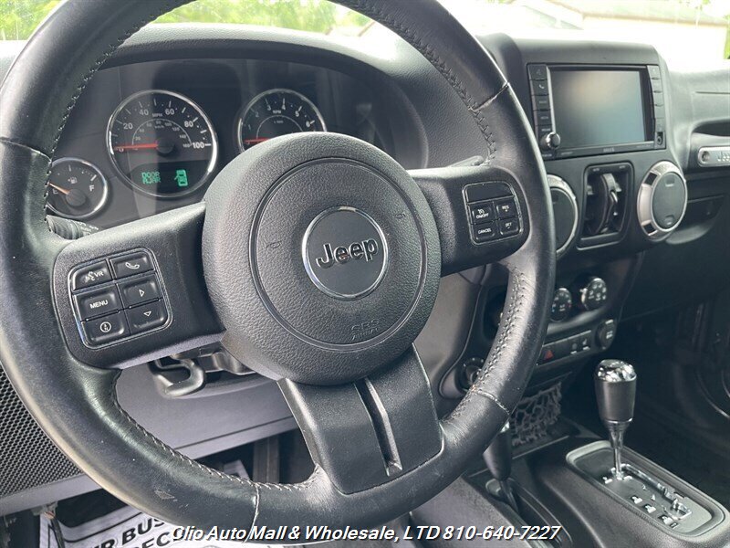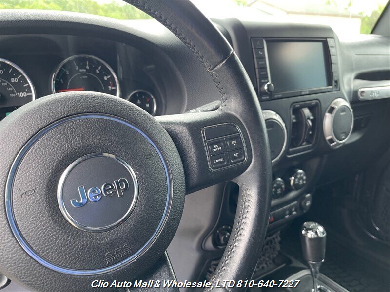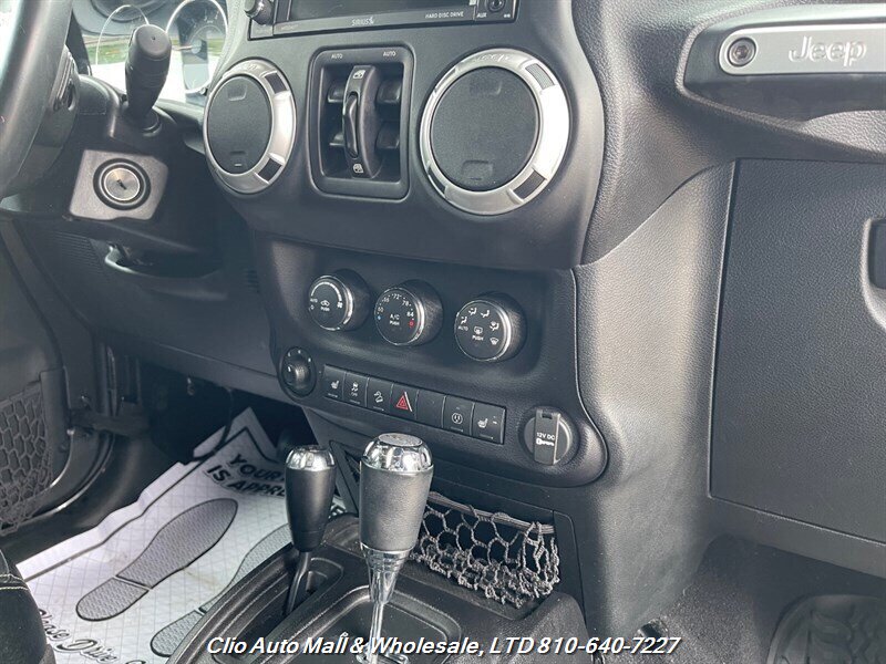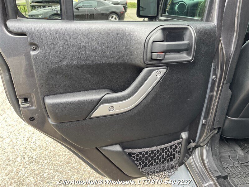 This 2016 Jeep Wrangler Unlimited Sahara 4WD comes with a spotless frame and is equipped with a powerful 3.6L V6 engine delivering 285hp and 260ft. lbs. of torque. The factory default features include the Connectivity Group, MOPAR Premium Sound and Leather Package, and Radio 430NAV. Optional features consist of Air Conditioning with Automatic Temperature Control, Supplemental Front Seat Side Air Bags, Alpine Premium Audio System, MOPAR Slush Mats, Remote Start System, Jeep Trail Rated Kit, 3.73 Axle Ratio, Engine Block Heater, Body Color 3-Piece Hard Top, Leather-Trimmed Bucket Seats, Max Tow Package, and 18.0 x 7.5 Polished Aluminum Wheels. The exterior is Billet Silver Metallic Clear Coat, complemented by a Black interior. This vehicle achieves 16 MPG in the city and 21 MPG on the highway, and is in excellent overall condition.